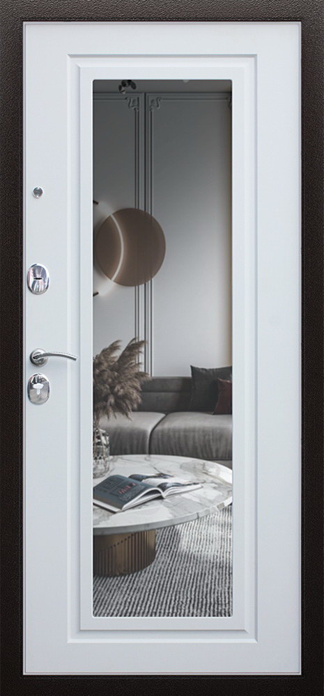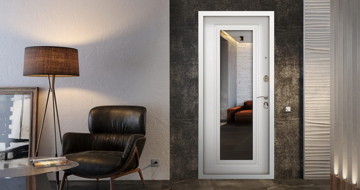 Стальная дверь Комфорт с зеркалом — практичный выбор для тех, кто ищет долговечную и сбалансированную по характеристикам дверь без лишних декоративных перегрузок.